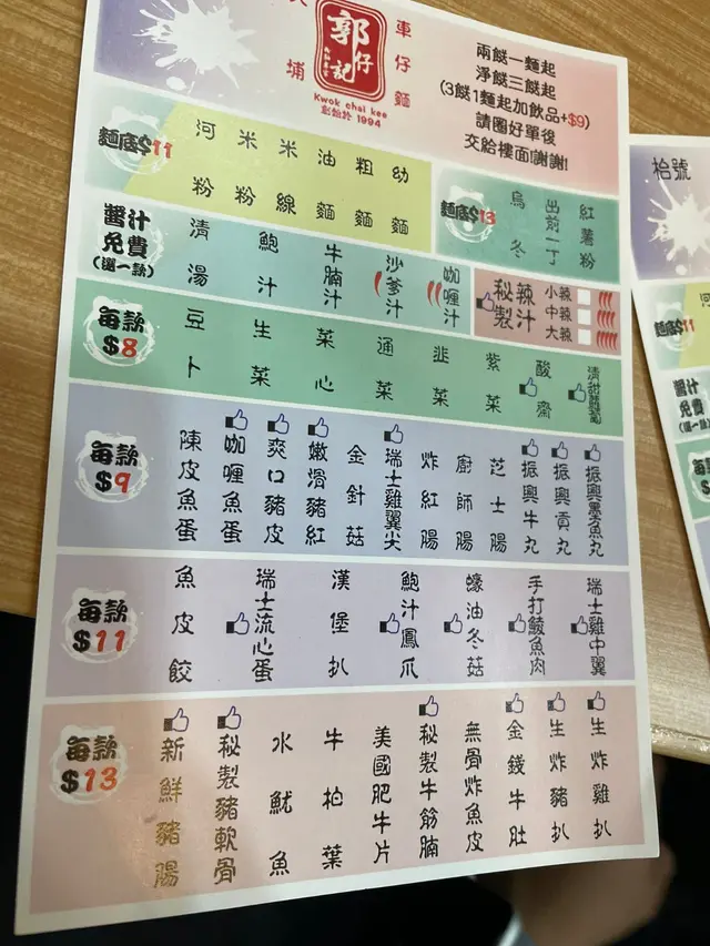 早兩日去咗大埔做野,做完野見有點肚餓,行過呢間車仔麵舖聞到好香牛腩味,二話不說就衝咗入去。呢到除咗車仔麵之外,仲有其他炒飯炒麵食,睇落都好似好吸引。不過人地個名都叫做郭仔記車仔麵,就緊係要試下佢個車仔麵啦。唔知係咪新裝修呢,環境都幾光猛企理,連個醬油兜都無果D萬年油漬,食都食得安落D。一睇佢個餐牌,有成幾廿個餸俾我揀,選擇困難症表示頭都大埋。D餸有4種唔同價錢,最貴都係$13,都算幾抵食。最後幾經掙扎終於揀咗豬軟骨+牛丸+蘿蔔&米粉(仲有條油菜送,唔係間間車仔麵都有)豬軟骨又淋又入味,骨位爽脆,肉位夠香唔會sip牙la。蘿蔔夠哂香甜,最後先食等佢吸一吸個湯底仲正。牛丸爽口彈牙,正常發揮。咁大碗都係$41,真係好味又抵食。p.s.食緊途中聞到隔離枱碟炒一丁好香,下次嚟一定要試下。…查看更多