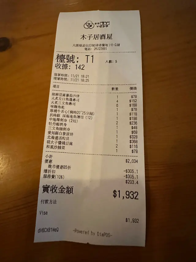 搬咗新界後一直都未有時間發掘好嘢食,今次朋友介紹到呢間居酒屋,燈光好有氣氛,晚市有85折優惠,所以平日的晚市人流都好多。刺身叫左深海池魚薄切新鮮又肥美,店員推薦食活粒貝,爽口鮮甜,串燒都好多選擇,食物好有質素,店員都主動幫我地換碟和加茶,食物和酒水都好多選擇。見到都幾多人食,值得再回頭幫襯,今晚聚餐家人都食得好開心。…查看更多