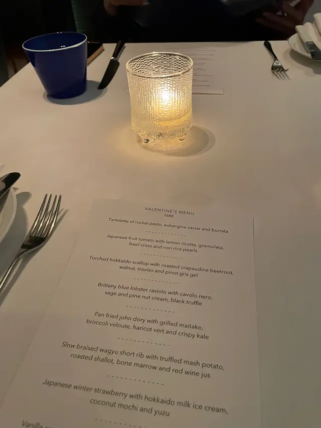 情人節日,為免情人失望。於是大老早已經做足功課,故找到了Arcane這一家米芝蓮餐廳訂位慶祝,免去了晚上要跪榴槤的悲劇。餐廳位置在商業大樓樓上,一進門後左翼是開放式廚房,可以看到廚師們都在忙碌工作。而倚著廚房的旁邊是一列列的Bar枱,實屬喜歡看廚師表演或跟廚師吹水的客人的最佳位置。餐廳廳面比較細小,大約能容納二十多人左右。而餐廳亦設有室外位置,是晚餐廳安排了在廳面的室外門旁的二人座位用餐。(門户微開,有點陰風陣陣,略寒冷。)因為情人對酒精過敏,所以是夜沒有點酒品嚐。我們點了sparkling water,而sparkling water 是free flow的,價錢以每位計算,是相對實惠。Sparkling water的味道清新,氣泡感適中,實在是每一部餐點的停頓之間的解饞好選擇。好,開始用餐了。每一次食西餐,我們最期待的一定是麵包籃。好的麵包能夠先聲奪人,壞的麵包很容易會影響了之後的用餐心情。很遺憾Arcane的麵包是令人失望的。第一,麵包的溫度不足,令味道失色。第二,麵包只有一個選擇。第三,牛油味道一般沒有獨特個性。在吃過令人失望的麵包後,侍應上了第一道菜Tartelette of rocket pesto, aubergine caviar and burrata 這道菜大小像「一口酥」(抱歉忘了拍照)味道其實挺好的,醬汁味道和味濃郁,味道調和得很好👍咸鮮味道充足而不饞。可是這「一口酥」比起稱為一道菜,應該稱為餐前小吃描述得更恰當。第二道菜是Japanese fruit tomato with lemon ricotta, gremolata, basil cress and nori rice pearls 好吃!這個日本蕃茄,其味道非常清爽甜美。再配以其他醬汁點綴,應該是今天晚上最好吃第一道菜。吃完這道菜後,我們忘記了麵包的傷痛,開始期待之後的菜色。第三道菜是Torched Hokkaido scallop with roasted crapaudine beetroot, walnut, Trevino and Pinot grits gel這道菜的主角看似是日本帶子,實質是紅菜頭。紅菜頭烹調得口感軟糯,而香氣充足。廚師成功把紅菜頭味道和口感的優勢煮岀來,而把我最害怕的紅菜頭草青味煮走了。可是最令人失望的,是他的帶子食材比較劣質,咬下去沒有半點鮮味。即使和一般食材店能買的刺身級帶子的鮮味相比,實在差太遠了。第四道菜是Brittany blue lobster raviolo with cavolo Nero, sage and pine nut cream, black truffle我是一個膚淺的人,看到藍龍蝦就已經雙眼發亮,可謂十分期待了。現實卻是在他華麗的菜色描述的背後,他本質其實是一個類似「蝦肉雲吞」的菜品。「雲呑」由兩塊意大利麵包著,再由白汁淋上,面頭上再佈上幾片黑松露片增加儀式感,最後還有顆粒果仁加強了口感。白汁的味道鹹鮮味充足醬汁口感絲滑,而菜品的溫度也足夠,吃下去的感覺還是讓人暢快。可是最關鍵的兩大主角 黑松露 和藍龍蝦,我們未能夠吃到他們獨有的黑松露的鹹香和龍蝦獨有的蝦鮮味道。第五道菜是Pan fried John dory with grilled maitake, broccoli veloute, haricot vert and crispy kale看到煎魚菜品初上一刻,心裏的感覺就是,太好了,終於有正式的菜式吃。縱使餐廳燈光昏暗,也沒辦法遮掩西蘭花醬的翠綠,煎John dory魚 伴着翠綠的醬汁,和脆炸羽衣甘藍跟長豆角放在一起,實在賣相吸引。可是吃下去,和之前幾道菜的問題一樣,配菜比主角吸引。不知是否與魚不夠新鮮關係,吃下去完全沒有魚的鮮味。反而脆炸羽衣甘藍的味道更強烈,實在令人摸不着頭腦。第六道菜是Slow braised wagyu short rib with truffled mash potato, roasted shallot, bone marrow and red wine jus因為有了前幾道菜失望的經驗,我對這道和牛主菜的期待感會趨向保守。我跟情人說,我敢打賭薯蓉和洋蔥會比和牛出色。情人笑而不語。在和牛主菜端上枱面的時間,我還是掩飾不了期待,畢竟全晚餐點的份量不太足夠,身體起了自然反應,希望吃得更多。和牛淋上了深褐色的紅酒汁,旁邊伴着打得順滑的薯蓉,薯蓉面上放上了一條精緻的洋蔥。這道菜應該是全晚最差的菜色。(和麵包並列)又可能比麵包更差,因為至少麵包的調味是可以的。慢煮和牛足夠嫩滑,可是肉的質感是一絲絲的,而吃下的感覺有點像吃豬展。最致命的要點,是完全吃不到牛肉的味道。而比和牛更加致命的錯誤,是那個紅酒醬汁。當吃下紅酒醬汁的一刻,我還以為自己的味蕾出現了問題。我和情人下意識對望,我問她,會很咸嗎。她說,非常咸。而我的打賭贏了,果然薯蓉和洋蔥最好吃。這道菜是全晚最差的菜色,我認為米芝蓮餐廳應該有一個更高遠的追求。可是吃到一個調味失當的菜式,實在令人失望。第七道菜和第八道菜Japanese winter strawberry with hokkaido milk ice cream, coconut mochi and yuzuVanilla canele, chilli chocolate truffle, passion fruit macarons 當甜品來到的一刻,也意味着整晚用餐來到尾聲。雖然前面的餐點不盡人意,行也不必懷有怨恨。就愉快的吃甜點吧!日本的士多啤梨和蕃茄一樣,沒有令人失望。最出色的是 天使之鈴Canele 口感外脆內軟,而麻糬餅也令人難忘。總結一下,這餐給我的感覺,最大的觀點是配菜俾主角強多了。不知道是否食材不足夠優質,即使在廚師的精心烹調後,依然沒法吃出該肉品應有的鮮味道。而紅酒汁調味失當,是不應該發生在米芝蓮餐廳身上,但卻不幸發生了。最奇怪的是,是晚的蔬菜類食物都特別出色。 (難道餐廳的預算都跑到蔬菜裡去了?)但無論如何,這間餐廳都是一個好餐廳,你可以感受到廚師在每一道菜色的努力💪希望有機會再光臨,可以吃到更好的味道。評價:我認為每一家餐廳就著他的價