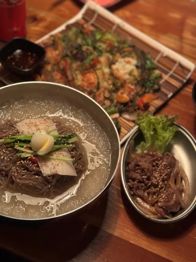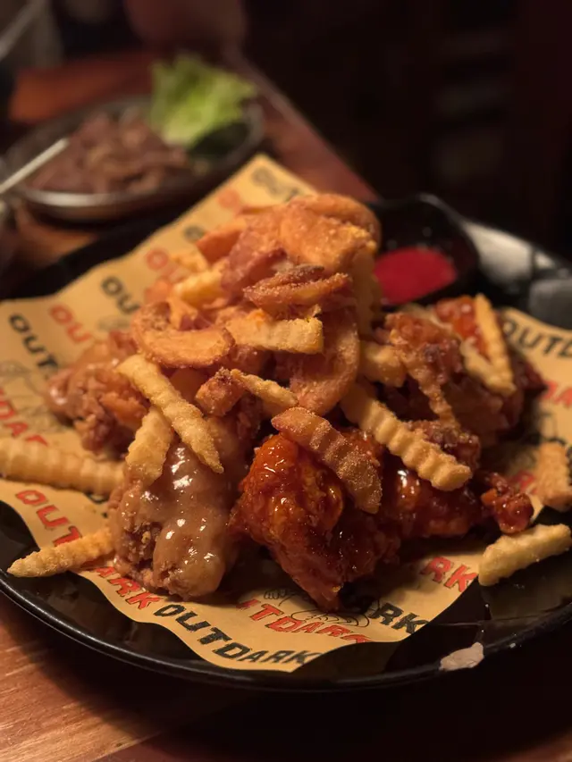 香港有唔少韓國菜選擇,但中伏機率都幾大㗎 ,變相食嚟食去都係嗰幾間。Outdark我之前都食過幾次,每一次都係食尖沙咀分店 。連店員都係韓國人,店員同店員之間都係講韓文,成個感覺特別道地 。今次嚟覺得最大嘅分別就係以前大排長龍要等lift上樓,但而家直入 🥲 。裝修同之前都一樣,黑孖孖嘅感覺,播住啲韓文歌幾有feel 。黎呢度一定要食炸雞,今次揀咗一半甜辣炸雞一半香蒜蜜糖炸雞 。呢度最特別係會配咗啲薯角等等嘅炸物 ,炸得好香脆,次次都食到好飽 都忍唔任食埋啲薯角 。以前有幾款醬汁可以俾你點,而家就要by request但可惜都係遇唔返好好食嘅香蒜醬 。發現多咗限定嘅水冷麵揀,以前唔識欣賞,早排去完韓國之後真係好鍾意食水冷麵 。冰冰涼涼,配住一啲油膩嘅嘢食真係好夾。呢度除咗水冷麵之外仲可以揀個配菜,我哋就揀咗甜甜地嘅燒牛肉。第一次叫海鮮蔥煎餅,雖然比較油膩,但非常香口惹味 ,配埋個酸酸地嘅醬汁,值得encore。之前同朋友黎係叫馬格利酒,今次唔飲酒就揀咗士多啤梨乳酪,唔會太甜,中規中矩 。…查看更多