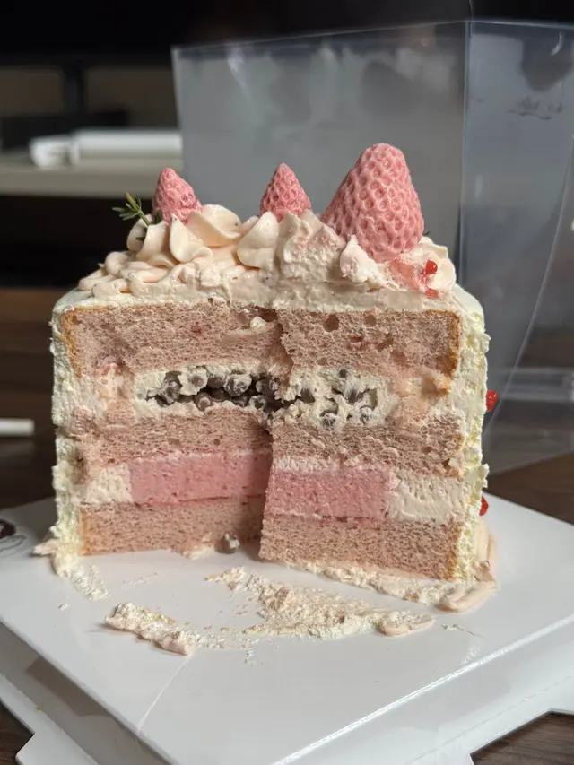 呢間係朋友生日指定想食既蛋糕,收工上去拎,店員都好好咁提醒要盡快放入雪糕。有需要的話,都好建議大家加錢要冰袋,畢竟鮮忌廉好易融。呢個4吋日式士多啤梨朱古力脆米戚風蛋糕,size真係剛剛好,食完晚飯大家影下相同淺嚐。蛋糕外型幾靚,味道整體唔會太甜膩,蛋糕體鬆軟,最鐘意中間個層粉紅色既士多啤梨乳酪mousse,酸甜唔膩。朱古力脆米就主要係為口感方面加分。試過安全牌後,下次會想試特別啲嘅款,例如芋泥爆漿流心 x 斑斕戚風。…查看更多