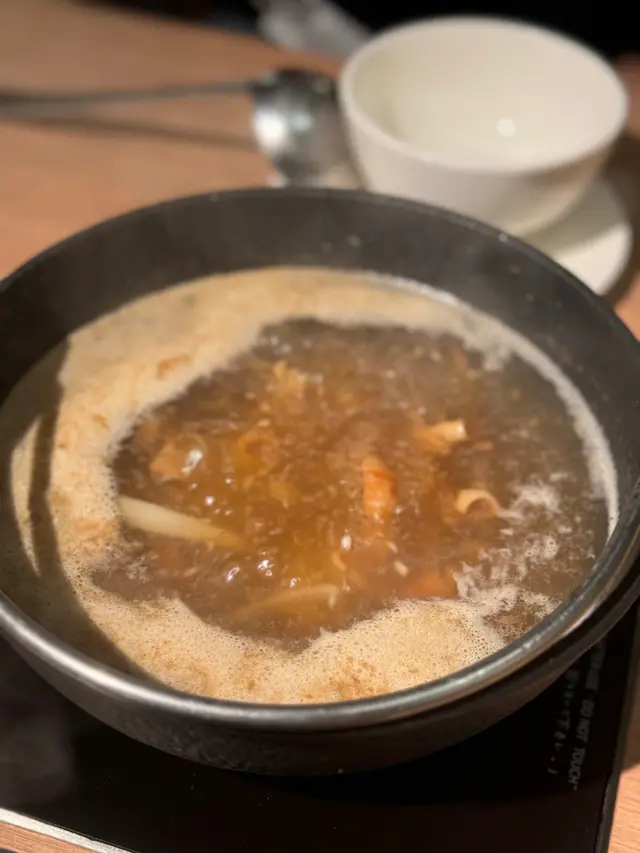 之前係台灣forum都聽過呢間,點諗到會開黎香港。香港一般常見嘅邊爐一係任食,一係散叫。呢到個叫法就好似一個set,有齊肉類、任食自助吧、主食、飲品同甜品。一去到感覺似去左台灣,店員用台妹溫柔腔講解。餐廳環境行日式簡約風,有種café感,幾舒服。平日個lunch set好抵,但社畜只能weekend去食,價錢就取決於揀咩肉。湯底分別揀左石頭湯同老佛爺,前者有好多魷魚乾,似潮汕風味,非常香;老佛爺就係藥膳,屬於入門級嘅藥膳,有香味但無藥材嘅苦。肉類揀左伊比利豬同霜降牛肉眼 。份量都唔少,但有個台灣火鍋常見嘅通病就係切得比較薄。相比之下我鍾意食豬多啲,有啲咬口。出面個自助吧有好多款,連醬汁都有啲特別嘅選擇。醬汁特別啲就有香醋醬,同埋洋蔥粒 。蔬菜方面擺得好整齊企理,竟然有莧菜揀 。其他配料嗰啲特別少少就係蛋餃、豬血糕、甜不辣 ,仲有自己任畢嘅豬肉滑同埋蝦滑 。香港打邊爐多數都係食完唔夠飽再加個烏冬,呢度套餐包埋主食,最特別係蟹膏飯,單食味道唔錯,但同打邊爐有少少唔夾,建議都係揀返烏冬或者王子麵 。飲品出奇地出色,叫咗奶茶同埋鳳梨冰茶,都有出面手搖店嘅質素 。食完仲有一客甜品,推薦焦糖燉蛋 。單睇weekend個價錢吸引力就唔係咁大,如果平日食lunch就非常之抵啦,畢竟還原到台灣風味,特別係湯底選擇同風味試 。…查看更多
