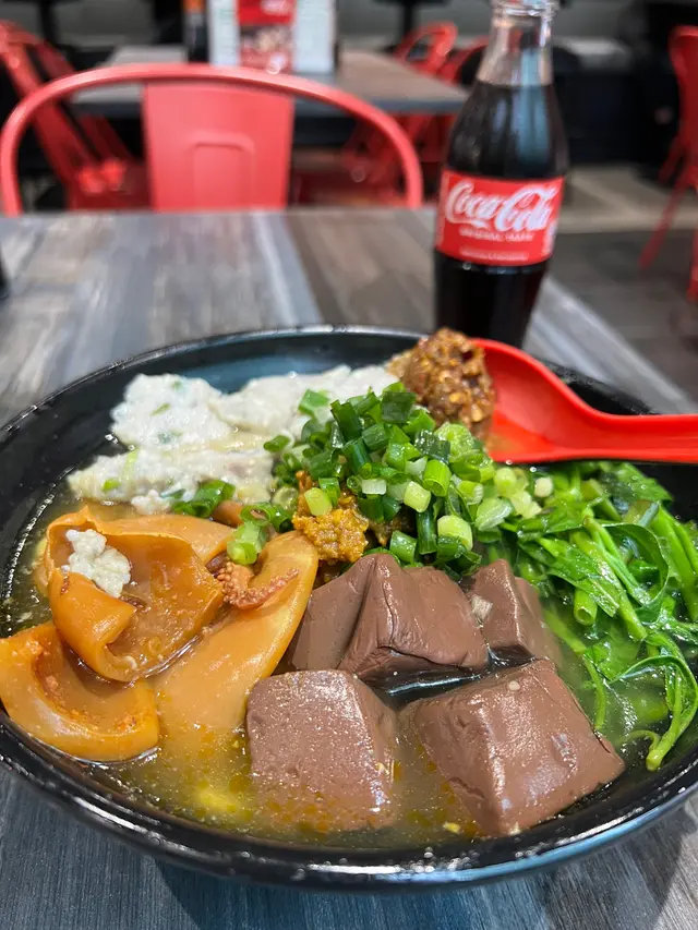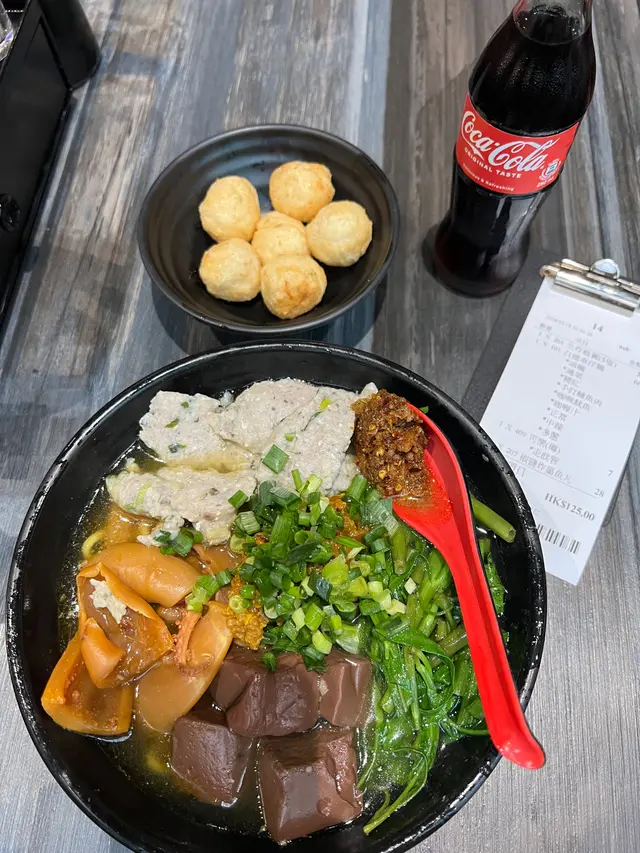約咗朋友喺奧運站但係未夠鐘,諗住搵個地方坐下先,見到附近呢間車仔麵幾多好評,又好耐冇食過車仔麵,咁就行過嚟喇,其實都係好近,奧運地鐵站行過黎6分鐘左右入到舖頭就覺得嘩呢間舖頭咁大間嘅,眼見好似有接近20張枱,仲有裝修風格,有現代x懷舊crossover. 用Qr code落單,除左車仔面仲有好多港式小食例如生菜魚肉、韭菜豬紅等等,本身我都唔係好肚餓,但係見到咁多咁吸引嘅嘢食都忍唔住越叫越多🤭叫左一碗通菜、豬紅、手打鯪魚肉、咖喱魷魚,揀左中辣,小食叫左生炸雞翼同椒鹽炸墨魚丸。碗車仔面真心高質,個湯底夠哂味,咖喱汁超惹味,豬紅好食,鯪魚肉彈牙,必試,生炸雞翼好似傳統茶餐廳食落係外脆內軟,墨魚丸都勁惹味,下次要試埋其他小食😋食左咁多野,飲埋樽裝可樂埋單先係$125…好正呀…查看更多