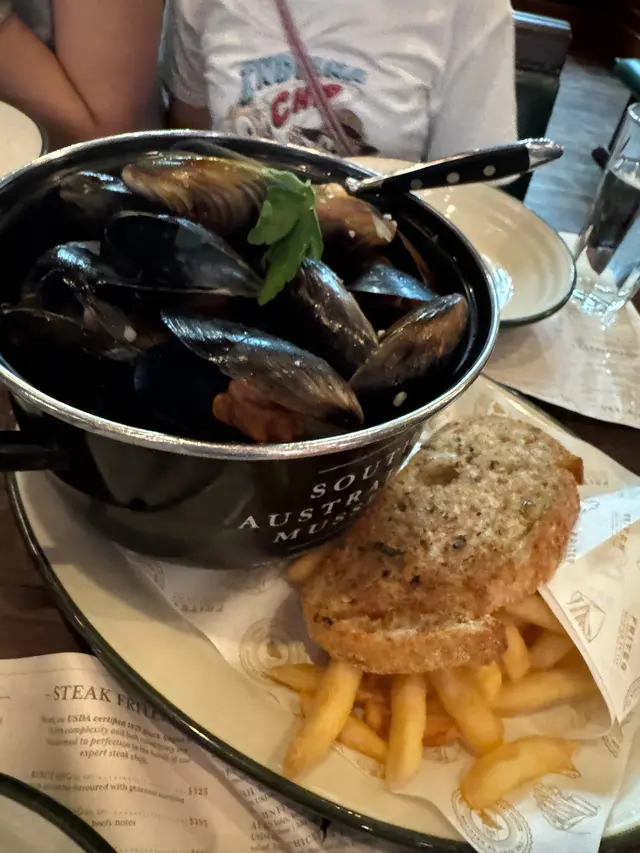 朋友一座低立即order最出名的青口,青口口味有幾種,但見每一枱都有叫,相信應該真係招牌菜,我哋最後叫咗白酒那一款。上菜時配有一塊大的蒜蓉包,十分惹味,點埋青口的汁簡直是絕配!不過我唔好青口的關係,朋友就負責清曬啲青口了