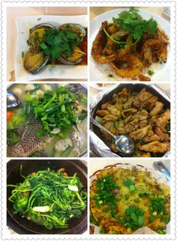 頭盤: 拍青瓜、椒鹽豆腐、鮑汁鳳爪、乳鴿小菜: 蝦、蒸鮑魚、通菜、順德大盤魚、銅盤污糟雞、炸鮮奶當中最特別就係招牌順德大盤魚, 如其名, 有一個大盤放左好多配料如魚腐、手打鯪魚肉等等再加條主魚, 本來係桂花斑, 但席上有個朋友仔唔食桂花, 所以轉左侍應推介的珍珠側, 第一次食, 肉質都唔錯, 幾滑! 魚湯底都幾鮮甜, 好次火鍋咁, 係面前滾滾下, KEEP住個溫度, 正! 另外, 銅盤污糟雞一打開鍚紙已經好香噴噴, 味道都幾特別! 仲有個炸鮮奶都推介, 香脆得黎, 唔會溜!而煎陳村粉都幾好食, 不過去到尾段, 實在太飽, 所以食左一半都係要打包拎走!