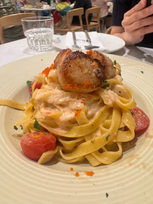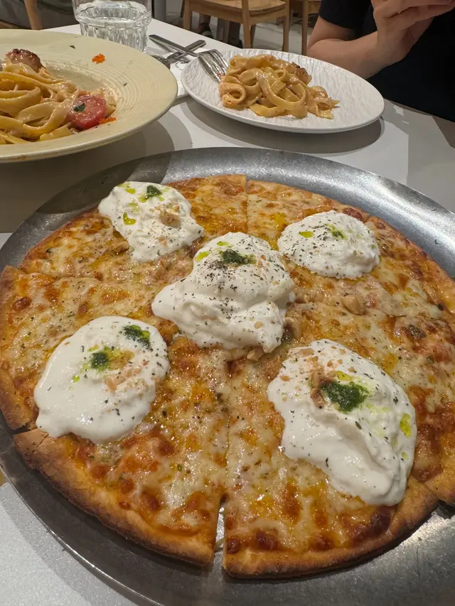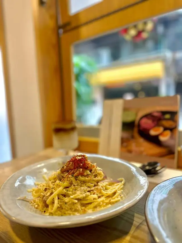 諗住去新城市睇煙火, 睇岩發現有一間環境幾好既文青cafe, 主打手工意粉, 見岩岩開晚市就walk-in試試, 之後見外面好多人排隊, 建議大家都係book位方便預時間🍽️酥皮野菌湯咁岩有一周年活動, 2-3位送一客湯🍲, 酥皮好香牛油味, 野菌湯亦好香濃🍽️明太子帆立貝意粉 ($168)一心想試手工意粉, 所以額外+$25cream sauce 好香濃, 粒粒明太子增加口感, 帆立貝都幾大粒, 份量幾足, 手工寬帶麵比較煙un有咬口🍽️布袋芝士薄餅唔記得價錢, 應該都係$138-$168呢個range自從食過一次burrata cheese salad, 就愛上左佢既口感餅底好香脆, burrata cheese好soft, 入面流心, 真係好正weekend 有brunch可以選擇, 下次想試試其他main …查看更多