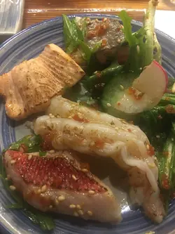 同朋友一年一度做冬,梗係要食好d啦!呢排食得太多中餐小菜,所以我哋就搵間日本磯燒試吓。先嚟個沙律醒醒胃 - 磯野火灸刺身沙律 - 真係好開胃,新鮮嘅沙律菜加埋酸酸哋嘅醬汁,再加埋粒粒芝麻好香口。刺身就大大件又夠新鮮,蝦肉彈牙鮮甜。鐵罐酒煮白貝殼- 白貝煮得剛剛好,鮮甜帶點清酒香,貝肉鮮嫩香甜。深海池魚刺身 - 刺身魚肉嫩滑鮮甜,魚油唔太肥膩。日本海膽味噌甲羅燒 - 松葉蟹膏+觸肉+北海道馬糞海膽嘅甲羅燒非常美味,海膽仍然保持濕潤香滑,配上梳打餅非常可口。北海道毛蟹 - 啖啖肉,蟹味鮮甜,蟹膏甘香。黑豚肉紫蘇卷 - 黑豚肉表面燒得香脆,咬落內裡仍保留到肉汁,唔錯唔錯!蕃薯雪糕 - 好濃郁嘅蕃薯味,清甜軟滑,好似食緊雪凍咗嘅煨蕃薯咁,好有趣。…查看更多