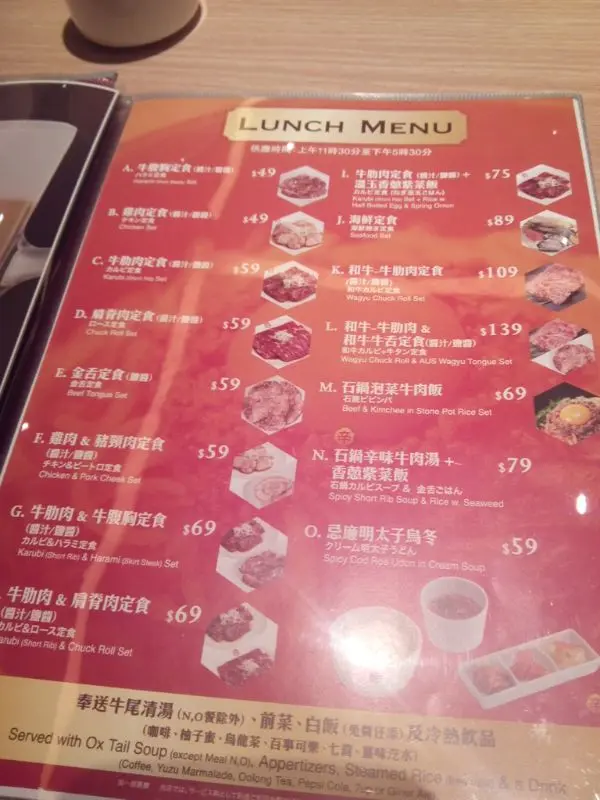 早兩個星期六去荷理活食日式一人火鍋,等位嗰陣見到隔籬新開呢間網燒,見佢平日啲午市定食都賣相唔錯,價錢都 ok,一直心郁郁想試。之後個禮拜即刻同同事報料有新嘢,醖釀咗一個星期,今日終於以即興形式拉埋兩位同事去試。話晒臨年尾工作量比較多,去食番餐好少少慰勞下自己叉吓電吖嘛。雖然係新開張,但去到坐低已經差唔多滿座。由於暫時未有訂檯服務,所以都係「早為上著」。呢間餐廳地座位好寬敞,我地一行三人坐張六人檯,加上地方又新,裝潢亦都好具日式味道,感覺非常良好。由於有優惠,叫咗牛腹胸、雞肉、牛肋肉同肩脊肉四款定食,其中一個免費。定食除左主打嘅一份肉之外,仲跟前菜,湯、飯同飲品。前菜係一碟三款嘅韓國泡菜(咦?網燒唔係日式架咩?),味道不過不失。湯係牛尾湯,有牛肉粒同蘿蔔,幾清甜。落 order 時侍應會問埋你每個定食要鹽醬定醬汁,即係咩呢?哦,原來份肉上碟前會用其中一款醬料醃一醃,咁燒完就即刻食得唔駛沾醬囉。燒呢個過程其實好快,小心燒焦。咁多樣之中,雞肉算係最易燒,燒完雞皮好脆口,正!而牛肉方面,真係一分錢,一分貨。最平嘅牛腹胸當然係最煙韌,肉身較厚而肥榚較集中,至於貴丁點嘅牛肋肉同肩脊肉就軟滑很多。至於招牌金舌同和牛就未有機會試。雖然三人食四人餐,但啲肉都係唔夠食,幸好醬汁撈珍珠飯相當好吃,若果可以任添白飯就最更好,飲品方面質素一般,咖啡亦似乎唔係即磨。服務方面侍應態度都好好,落單嘅時候仲特登提我地有買三送一優惠。臨走前經理仲送咗左張會員卡我地,話下次散叫有9折添。唯一可以彈嘅就係食物上檯速度真係有待改善,明明係一碟碟嘅生肉,都要攪咗成十幾分鐘先上到檯,趕時間的話就分分鐘會激死。整體上講,午市定食以網燒嚟計真係好抵食。返到公司我地周圍同人講,大家聽完不知幾恨想快啲再嚟試試添!…查看更多