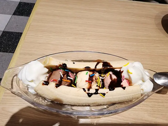 今次同老公再嚟呢間餐廳食下午茶同小食,就叫咗懷舊香蕉船,迷你焗豬扒飯,一口雪花西多士再加兩杯餐飲,梳化卡位又不限時,唔使$150就可以埋單。食物份量雖然細份咗啲,賣相都尚可,味道就差咗少少哦!除咗香蕉船味道可以之外(而香蕉船只係老公想懷緬下童年時光而嗌,係三個雪糕球,香蕉同朱古漿整合而成的甜品)。迷你焗豬扒飯熱度足夠,豬扒軟冧易切開,微咸,飯質乾硬又無加蛋炒起。一口雪花西多士用厚多士炸到金黃香脆,但餡料唔係奶油花生醬,就比較失望囉~