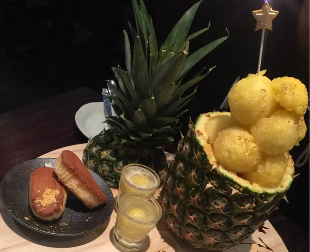 店員端出來的巨形菠蘿吸引全場目光