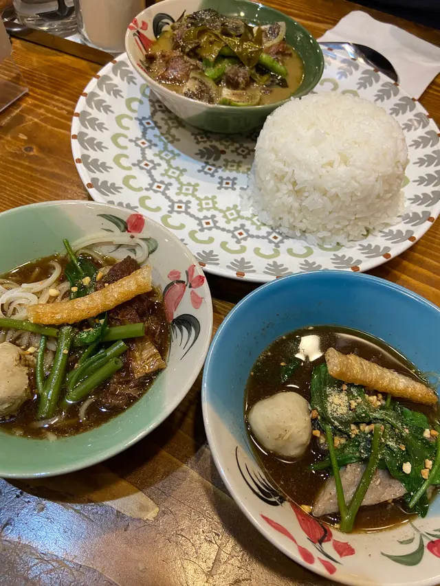 1. 青咖哩牛腩飯咖哩汁有少少稀,不過好惹味,唔食得辣嘅,會覺得幾辣下🙈有泰國茄子👍牛腩都稔嘅!2. 船麵層層疊 (牛肉,豬肉)有3款選擇,仲有雞肉。麵可以揀金邊粉,河粉,粉絲,米粉。今次試左金邊粉同粉絲,2樣都好食,軟硬適中。牛肉有牛丸同牛腩,豬肉有豬肉丸同豬肉片,豬肉片勁爽脆!食法可根據枱上嘅tips: 加入魚露,白糖,白醋,辣椒粉。加左呢啲調味料會多左層次感,會更加好食!3. 蝶豆花芒椰奶香2杯係同一樣飲品,不過用咗唔同嘅杯。椰奶味唔係好夠🤔推薦指數:⭐️⭐️⭐️⭐️/5————————————如果唔多客,唔會趕你走,音樂都幾新🤭裝飾都幾有泰國feel🤣服務態度好!…查看更多