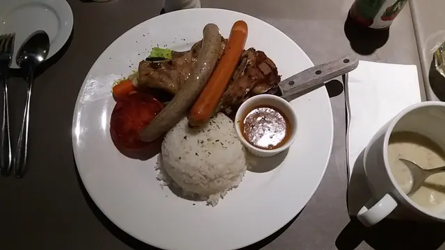 忌廉磨菇湯用鮮菇打成,唔係鑵頭貨,好味,跟蒜蓉法包,仲熱既(最怕餐包係凍既)美式什扒(跟飯) 有豬,有牛,有羊架,有腸,全部都唔錯,係牛扒差少少檸檬撻麻麻,上層蛋白太甜,檸檬mousse無檸檬鮮味,撻底唔脆即磨咖啡香濃,跟一塊牛油曲奇令好感度提升…查看更多