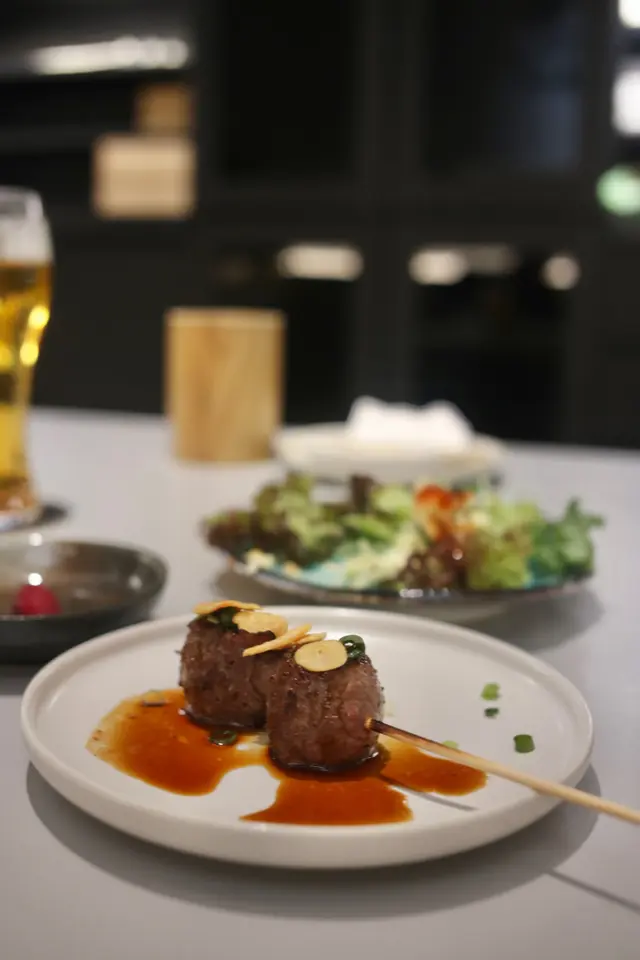 小編最近比較忙所以都比較少update😹 今次同朋友嚟到一間好特別嘅日本菜餐廳,即刻同大家分享吓先~ 餐廳裝修唔似傳統嘅日式餐廳,比較似Cafe,座位係一個個卡位,坐落寬敞舒服!🌟 鹿兒島黑毛和牛 廚師發辦 ($688)入到嚟即刻比隔籬枱嘅和牛吸引住😂 所以即刻叫咗個黑毛和牛廚師發辦!廚師發辦包括兩道前菜、一道沙律、六串串燒、一道和牛兩道和食、主食及味噌汁。🌟 前菜前菜方面有紅酒蕎頭同埋螢光魷魚刺身,份量唔多 作為開胃菜一流。🌟 沙律沙律份量都幾多!薯蓉配上醬汁生菜同埋飛魚子👍🏻🌟 串燒🔸 五花腩韭菜花蝦卷五花腩好香,一個係配韭菜一個係配花蝦。花蝦食落彈牙,韭菜則有另一種清新嘅感覺~🔸 蕃茄安格斯牛肉安格斯牛肉入面包住咗個蕃茄仔,食落幾特別,亦都好入味😋🔸 麥樂雞 呢個麥樂雞唔係M記嘅麥樂雞!而係以雞中翼包住墨魚滑🤤 咬落啖啖肉,以雞肉嘅嫩滑配搭上墨魚滑嘅彈牙,口感十足👍🏻🔸 雞肉棒棒日式雞肉棒棒有啲似係大嘅雞肉串燒,外層烤得酥脆,內裡多汁,雞肉口感香嫩,搭配獨特的日式醬汁同蘭王蛋,一個字:Jeng🤤🔸 雞肉、茄子雞肉串燒和茄子串燒各具特色。雞肉烤得香口,外面有少少脆,茄子鮮甜軟綿。口感層次豐富,結合烤焦的外皮和柔軟的內在!🌟 和牛和牛肉質鮮嫩多汁,油脂分布平均。搭配炸蒜、洋蔥、蔥和芥辣調味,口感更加豐富濃郁,肉香與調味完美平衡,讓人愛不釋手,食到停唔到!🌟 和食🌟 主食及味噌汁🔸 明太子燒飯團 茶漬湯 明太子燒飯團搭配香氣四溢的明太子醬,口感結合軟糯的飯團和鹹香的明太子,美味迷人。茶漬湯清爽宜人,與燒飯團相輔相成,帶來滿滿的日式風味享受。🌟 芝士酒盗 ($68)另外我哋都單嗌咗個小食~芝士酒盜係以高濃度鹽腌漬鮪魚、鮭魚、鯛魚、秋刀魚等內臟製成。叫酒盗嘅原因係其下酒的程度讓人覺得喝到以為酒被偷走了🤣,搭配芝士🧀味道恰到好處👍🏻👍🏻😋🌟 生啤、白桃梳打 ($88、$42)…查看更多