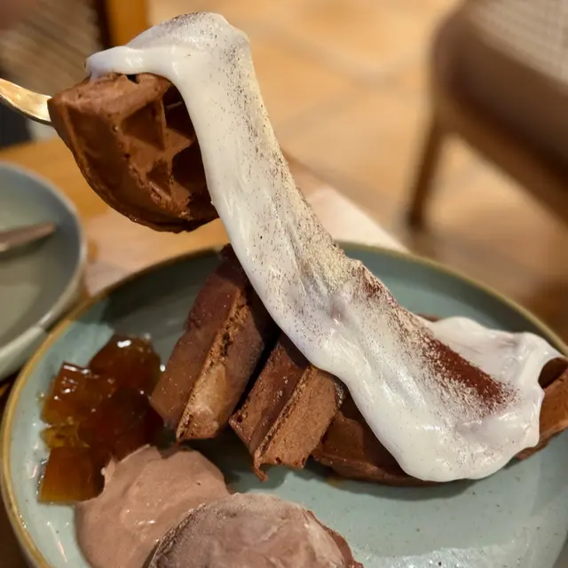 落地玻璃,簡約木系設計,環境好舒服~必食signature嘅窩夫!🔸All day breakfast $98慢煮雞胸肉|黑松露日本本菇|炒蛋|自家製烤芝士酸種麵包好難得有一個全部食材我都食嘅all day breakfast!雞胸慢煮完再微微煎下,好香好好食🤤一啲都唔「鞋」鍾意將本菇、炒蛋、麵包夾埋一齊食如果烤芝士可以多啲就好😌🔸龍蝦汁配大蝦三文魚籽手工義大利寬帶麵 $188好濃龍蝦汁味寬帶麵厚薄度適中,有咬口(超怕太厚嘅寬帶麵,食落好粉咁)煎蝦有簡單調味,爽口彈牙🔸海鹽焦糖比利時朱古力麻糬窩夫 $168甜品令成個dinner嘅滿足感提升超多仲可以加生日牌&蠟燭拉麻糬打卡able窩夫外脆內軟朱古力好好食!濃而不甜❤️…查看更多