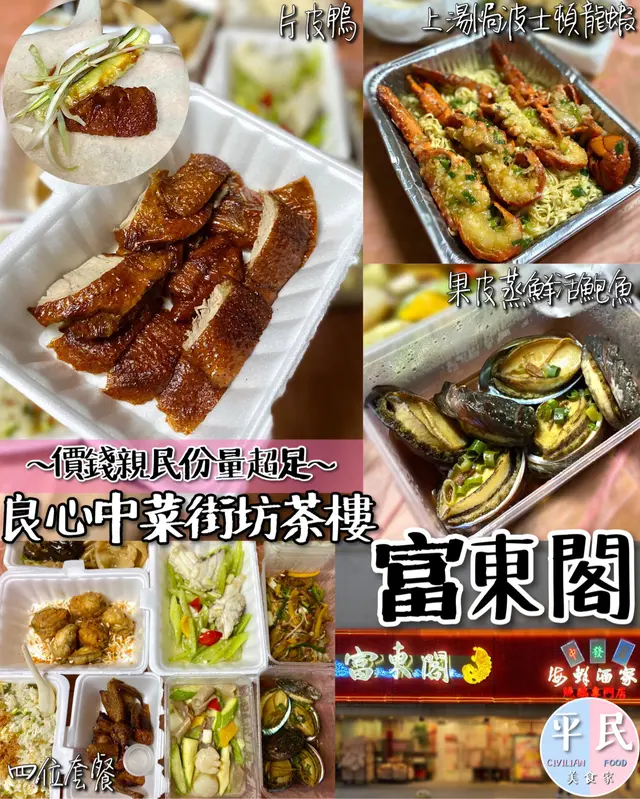 🔎:《 #富東閣 》💬: 良心中菜街坊茶樓~早排屋企人生日想食好啲,所以就特登去富東閣買外賣。見到好多人都讚個片皮鴨,緊係要試啦!▫️京式片皮鴨 ($178 )片皮鴨份量都算好多,都包到成十幾舊架,不過略嫌佢鴨皮片得唔夠薄,好多肉黐住喺皮度,同埋可能外賣嘅關係,食嗰陣啲皮有少少淋身。(+$30兩食)▫️四位套餐 ($938)四位套餐都好多嘢食!包括龍蝦伊麵、花膠鵝掌、帶子、象拔蚌、龍躉同埋燒乳鴿等等,六個人都食唔哂,每樣嘢嘅份量都超級多,味道都係正常水準。▫️陳皮蒸鮑魚-半打 ($128)鮑魚超新鮮又大隻識落好爽口唔會有腥味!▫️椒鹽鮑魚-半打 ($138)如果係外賣嘅話就建議都係揀返蒸鮑魚,因為椒鹽鮑魚係炸嘅,拎返到屋企嘅時候個皮已經淋咗冇咁好食。( 3/5分)…查看更多