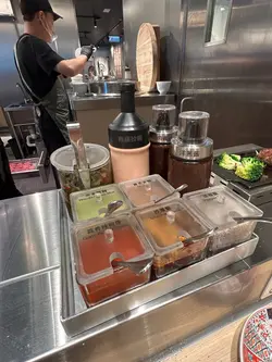 坐下來, BAR枱已有 DETOX WATER 和多款醬料供調味.