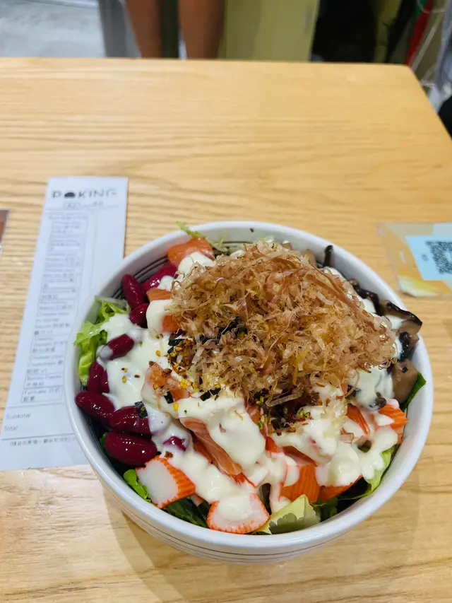 我哋三個女仔lunch食得太飽,所以夜晚打算輕食,第一時間諗到食沙律,但係一到咗夜晚,上環就會變成美食的沙漠,好多舖頭都唔開。於是乎上OpenRice look look先,就見到呢間poking ,入去望望Menu, 食物都幾精緻,不過價錢就……但係一個鐘食飯時間,真係冇乜選擇,所以我哋都決定去試吓。去到舖頭,小店一間,大約十幾個位,坐低用QR code落單,我揀咗自選沙律bowl, 糙米飯加沙律菜打底, 刺身三文魚為主菜,配菜係蟹柳、蘑菇、紅腰豆,上面再鋪滿咗木魚絲同飯素,再淋啲芥末乳酪沙律醬。當個沙律bowl送上枱時,我都嚇咗一跳, 個bowl 都幾大下,仲要鋪到勁滿,完全無從入手🤣🤣三文魚都幾新鮮,其他配料都好好味,呢間嘢性價比真係超高,期待下一次🥰🥰…查看更多