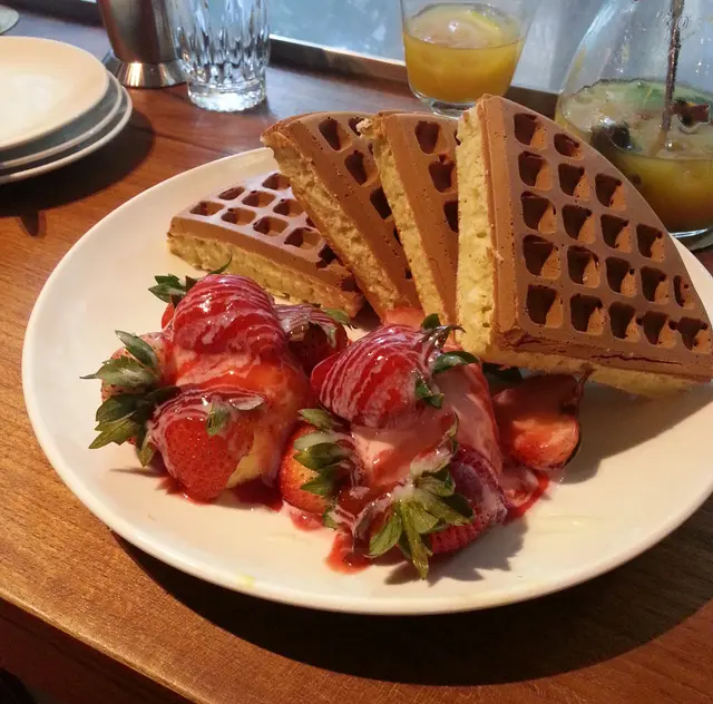 .四件大鬆餅, 加一球草莓雪糕, 一球吉士, 同埋幾粒草莓.鬆餅好香, 亦夠鬆軟, 啡色那邊是脆的, 幾香口, 有淡淡的可可味.另一邊似實少少既蛋糕口感, 挺不錯, 再配埋雪糕, 好味道.可惜的是草莓是酸的, 沒有半丁點甜味. 吉士似是即溶吉士粉開的, 沙沙的, 唔夠滑, 亦都唔香.鬆餅吃一塊已經很飽, 假若有MINI SIZE, 會好很多