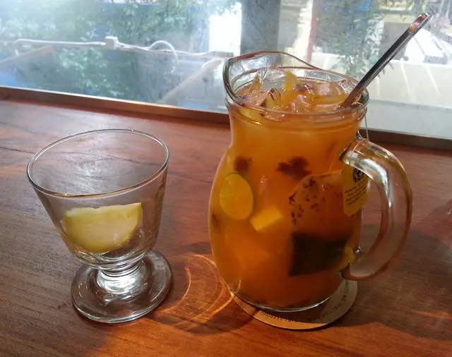 其實坐Bar枱都唔錯, 有少少街景睇下.因為未食午餐既關係, 我地叫左兩樣野食, 兩杯野飲, 呢道最低消費係一人一杯野飲.先黎杯冰鮮果茶 $58, 好大的一杯, 同價錢成正比.入面都幾多生果, 橙, 蘋果... 酸酸甜甜, 幾清新, 幾開胃