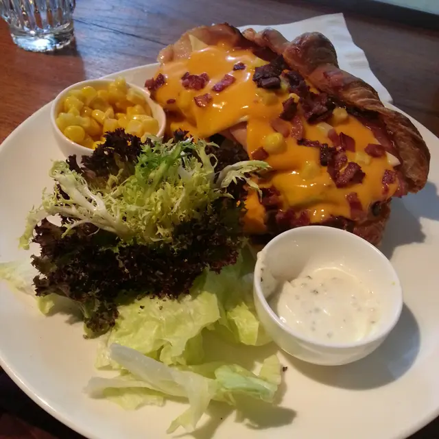 另有一個細杯, 入面有粒檸檬冰, 幾得意.過左無幾耐, 好多食家推薦既粟米芝士肌里肉可頌就到了感覺好豐富, 味道其實幾好, 但可惜可頌是凍的, 都幾失望