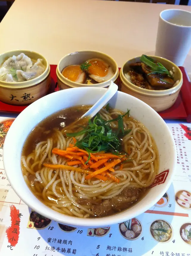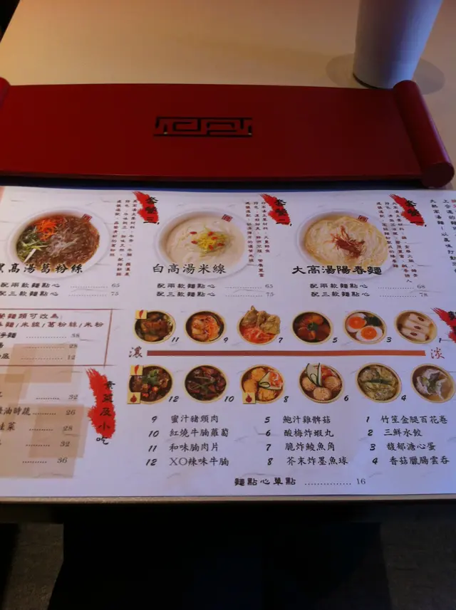 !!原以為牛湯會很濃郁,事實剛巧相反,一吃下去竟然覺得有些清淡,藥材味較濃之餘又不失牛味,比起單純濃陏牛味更為驚喜,大滿足。店員雖然推介黑高湯與葛粉絲為最佳拍檔,但我選擇了米線亦覺非當匹配,還是選舉自己喜愛的比較好~~而小食有12款選擇之多,幸好我一早就到,服務員向我逐一介紹,服務不錯^^。從餐單看出,1-12款小食應該由淡至濃排列,我建議選舉應該平均D就最好喇!終於我點了三款小食:馥郁溏心蛋,正,溏心得來竟然有紹興酒香,別具風味三鮮水餃,皮薄餡靚,雖然有上湯,外皮亦不鬆散,手藝不錯,可惜味道不突出和味腩片,少少辣,惹味非常!作為一個lunch價錢比較貴,但絕對值回票價,一定再來,下次必試大高湯陽春麵(雞湯)及酸梅炸蝦丸!!…查看更多