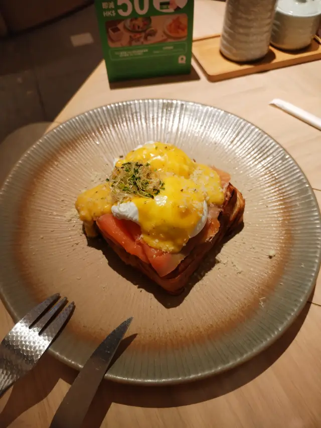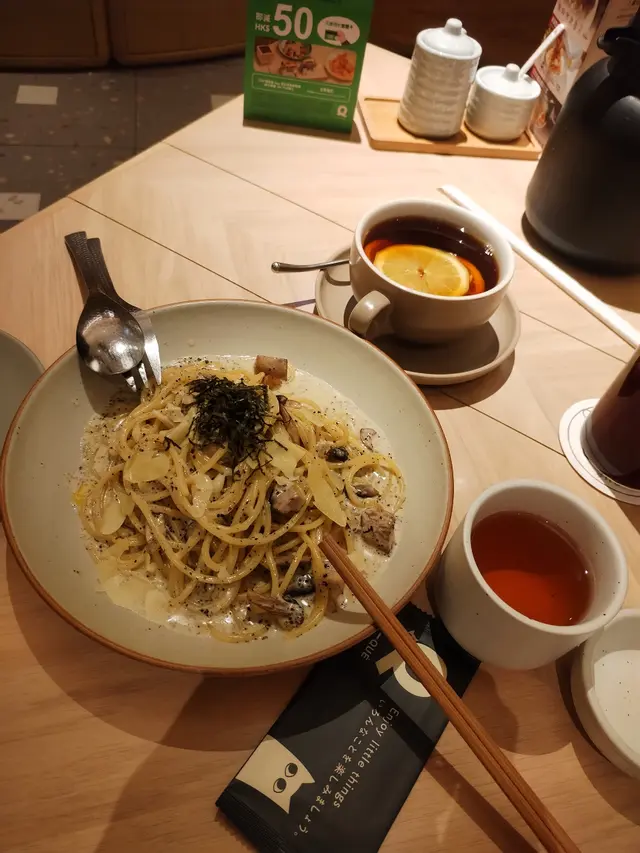 同朋友睇完戲,諗住食個tea。行去希慎搵食,見到咁大間日式餐廳,評價都唔錯,就嚟試啦。地方好大,好多梳化卡位,整間餐廳木系為主。我吔叫咗兩個tea set,松露雜菌意粉,煙三文魚菠菜班尼迪蛋。松露意粉好多汁,掛滿哂每條意粉,雜菌份量正常,味道唔錯嘅,意粉比較硬,有咬口;煙三文魚唔咸,啱哂我,班尼迪蛋切開流心,滿口蛋漿,略嫌唔夠香滑,菠菜份量比較少,值得講吓塊多士係手撕包質地,外脆內軟,如果大塊啲就好啦