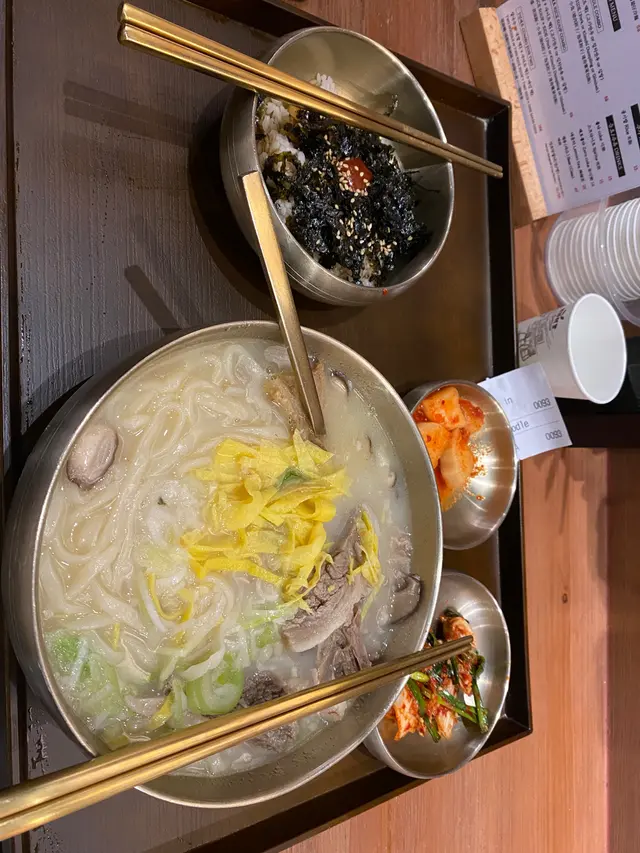 今日跟朋友食午餐,佢話每次經過都多人排隊,想去試下如何?今日約兩點到,可能剛過lunch time,僅等兩、三分鐘就入得。我揀了牛肉湯麵餐,加了泡菜餃子,套餐價$88。但上枱時,還附上兩款(泡菜、白蘿蔔)前菜,及一份紫菜飯(免費)。因為碗麵份量都多,我食晒啲餃子和麵都好飽,個湯麵啲牛肉都多,好淋,而湯的顏色較淺,其實品道濃郁,味道不俗。至於個紫菜飯,我就外賣盒拎走。其實餐牌食品款式唔多,但我見其他食客的食品,一樣份量十足!我覺得食過就算,正常,可能我不是韓式食品狂熱者。但若要排太耐,我就唔會考慮😊總體乜都有,算抵食😀:)…查看更多