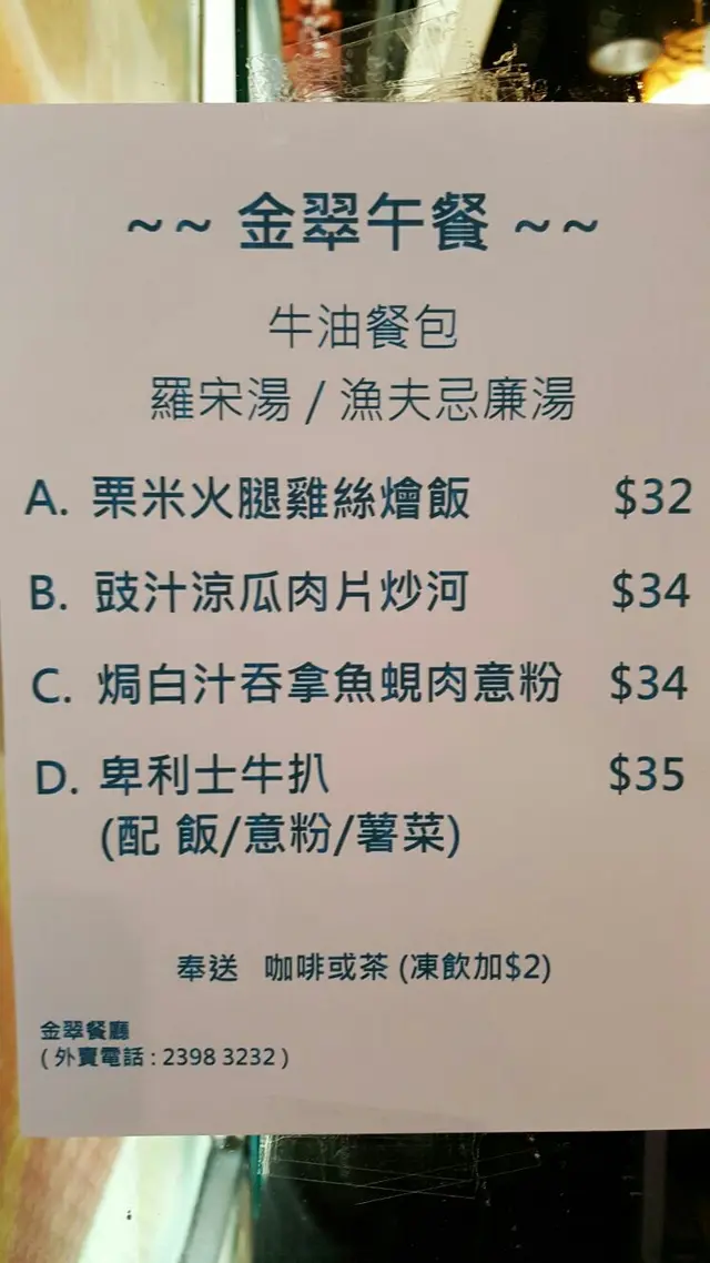 金翠是我家 金翠餐廳 2017-02-10除左放假只要翻工日日都來,因為金翠是價廉物美,價錢停留於我讀書年代!三十二蚊有一個午餐依家去邊度搵!餐湯羅宋湯十分足料,帶有少少酸辣,偏甜!今日食河粉,豉汁好有味,肉又好多好霖,最特別係河粉,非出面用的炒河又粗又厚,係用湯河炒,幼d滑d,好入味!能令我日日如是都來,除左食物質數高,最重要係呢度有人情味,呢度老闆員工打成一片,對d客人有講有笑,對熟客口味清楚,未出口己記得要咩,多飯少飯也可,令人有一家人的感覺,平時午餐好多人排隊架夜晚好少食,眼見有人話服務態度差,我又唔係好想信啦,不過知道呢度係會急d,無非都係薄利多消做多d生意,收咁平價錢自會明白人地需要,係呢度食野聽最多一定係笑聲,自覺服務態度一流,不過明白同行如敵國,實有呢d野,見他們全家人落力工作,作為香港人一定會支持呢d小店,希望多d呢種店出現啦!加油努力…查看更多以上食評乃用戶個人意見 , 並不代表OpenRice之觀點。1分享金翠是我家 金翠餐廳 https://s.openrice.com/QrbT0y4sKW0檢舉 張貼 評分4味道3環境5服務3衛生4抵食用餐日期2017-02-07等候時間2 分鐘 (堂食)人均消費$32 (午餐)