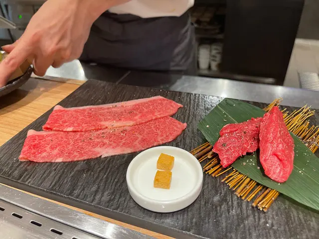 燒肉而今係日本米芝蓮一星懷石料理富小路やま岸旗下的餐廳,燒肉店採用日山畜產直送的和牛。如果你一早預訂最貴的omakase套餐,就會有專人幫你燒!而當日我係walk in 的,所以嗌咗À la cart 同埋自己燒🙈 一行入餐廳,會見到有一個玻璃櫃嘅和牛,已經急不及待好想試