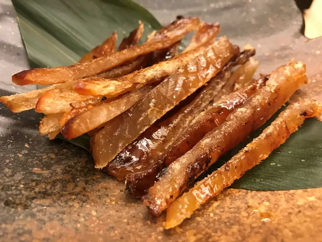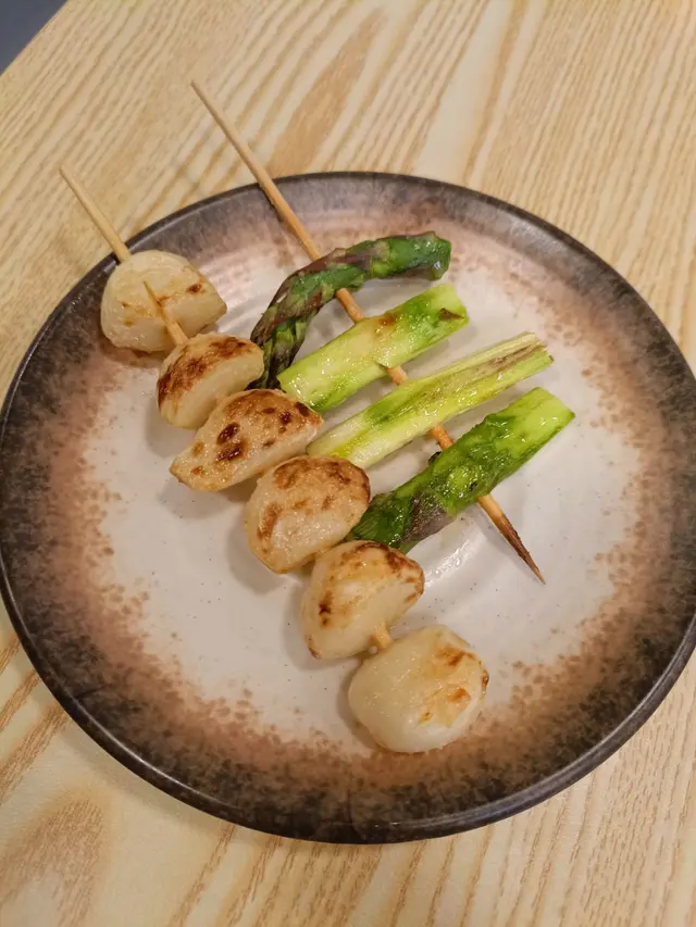 呢間餐廳我同同事lunch 都變左做半個飯堂咁濟, 早兩日見到佢擺左d 宣傳單張, 原來佢地開左晚市做日式串燒, 樓面姐姐話因為人手問題, 所以暫時只接受預約既訂座先。 食完個lunch , 同事都話有興趣試, 佢地話星期五可訂位, 見佢menu 都唔算貴, 於是就book 黎試試佢。 我地3條友book 左6:30 , 可能唔多人知, 所以唔算多人, 可以慢慢傾下計。 個晚傾得太開心, 所以頭round 先有影相:燒蒜頭同露荀個蒜頭可以間生d 同熟d , 我地比較鍾意熟d , 無咁辣口。 好味