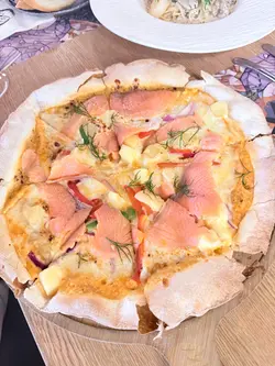 面頭鋪滿晒三文魚,加埋佢個 cream sauce 同紫洋蔥,食落好香好 creamy 但又完全唔會膩,個餅底又夠薄脆,平時少食 pizza 嘅我都食唔停口。