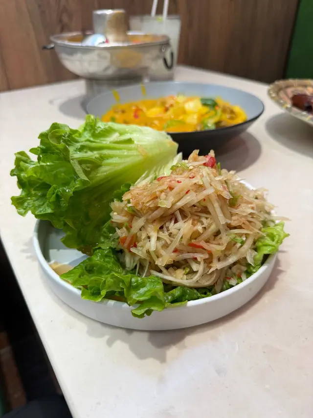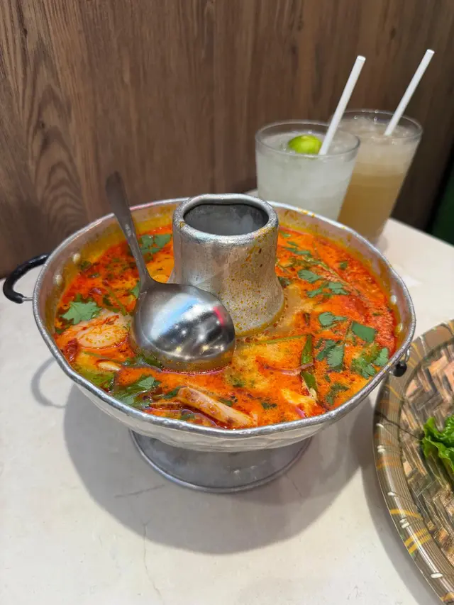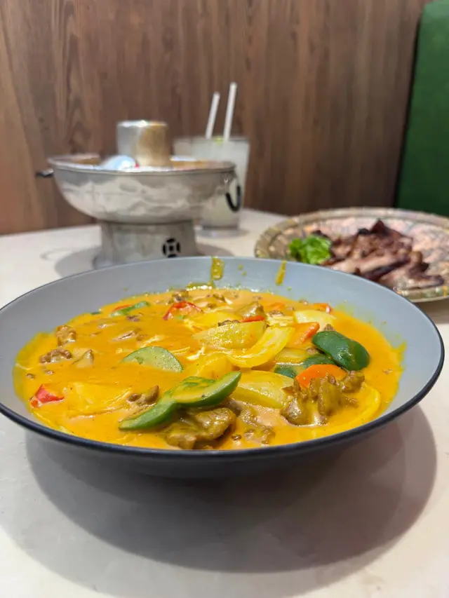 元朗西菁街嘅「公車泰國餐廳」門面好搶眼,兩尊泰國雕像掛住橙色花圈好有儀式感!今次我地一行三人叫左二人餐$388,再加咗蒜蓉包同黃咖哩牛肉,食到好飽好滿足!黃咖哩牛肉 $88一試難忘!咖哩汁椰香味超濃,一啲辣都冇,撈白飯食到停唔到口。蒜蓉包 $48香脆,咬落咔咔聲,點咖哩汁簡直係靈魂配搭!木瓜沙律,酸辣爽脆開胃。炒蜆嘅辣汁香濃到想拎嚟撈飯冬蔭功海鮮湯料好足,蝦、青口、蘑菇樣樣齊,酸辣醒胃。豬頸肉同秘製醬汁。加$1換嘅冬蔭醬骨燒跟餐嘅青檸冰同香茅冰夠晒大杯,甜度適中,飲完成個人都refresh咗~餐廳座位闊落,我哋坐卡位擺到成枱餸都唔逼。小總結:整體嚟講,呢個價錢有齊湯、沙律、主菜、飲品,性價比高。為咗個蒜蓉包同黃咖哩絕對會再encore,下次想試埋佢個泰式海南雞!#元朗好去處#元朗美食 #YuenLongFood#泰國菜 #ThaiFood#香港美食 / #HKFood#蒜蓉包 #冬陰功…查看更多