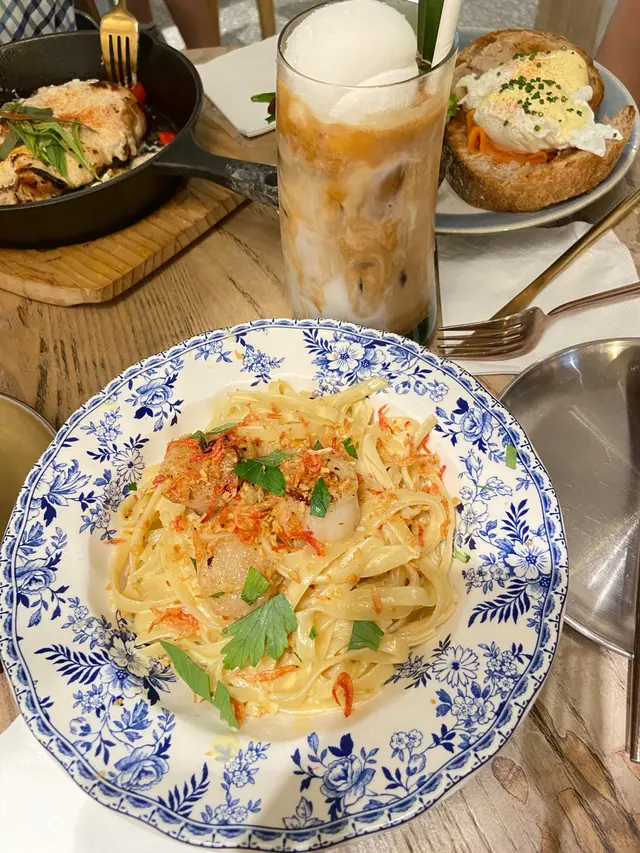 网上看到这家店评价还不错,所以周末决定过来一试。看到这间top 1的是忌廉腐乳酱北海道带子阔面,就点了一份试试。带子没毛病,阔面也没毛病,但是这个忌廉腐乳酱配这个面实在是太奇怪了,总觉得好像少了通菜一样,和白酱意面完全不搭,违和感超强,店家还是做点传统的大虾带子茄汁意面更好?另外比较踩雷的是斑斓咖啡。端上来的时候上面浮着一个白色看起来是香菜雪糕球,一勺子挖下去像是冰冻过的奶油非常油腻好像在吃黄油?咖啡味道也一般般,融化了这个奇怪的奶油这个整杯饮料变得浑浊油腻,不如替换成普通的香草冰激凌好过?总之整体的体验非常的一般。…查看更多