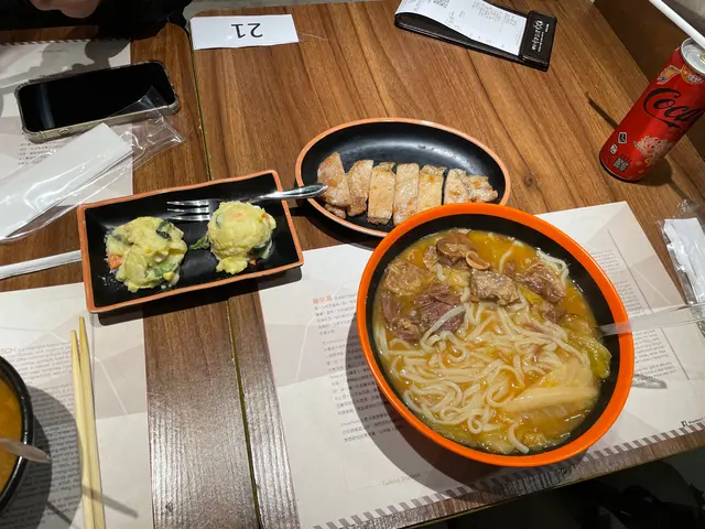 試埋之後更加無言😂😂 牛腩超級硬同韌,唔係好咬到,啲湯同個色一樣水汪汪,無咩味道... 都算啦,塊雞扒一嚟到,嚇親🤢😂... 乾到無得頂,食落好似柴咁...