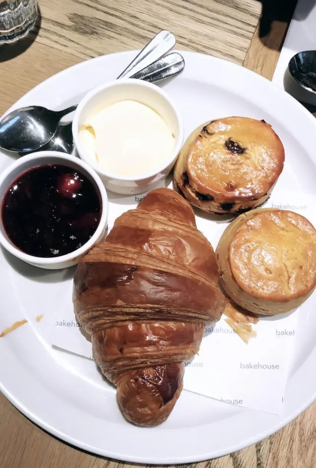 個個朋友都講起呢間四季酒店餅房行政總廚開既Bakehouse,上星期把心一橫同朋友黎試,等幾耐都要食到佢既牛角包,3點幾去到離遠已經見到有條長龍,就算係買外賣既都好長龍,我地等左45分鐘終於入得去.. 先試佢地每日新鮮自製既湯,蘑菇湯上面加左炸蒜片同蔥粒,唔稀亦唔杰,好香濃好滑,味道都好正,佢配埋既麵包好脆就咁食可能有d硬,沾埋d湯後口感就岩岩好~主角終於出場喇,bakehouse最出名既牛角包,第一口食落去真係嘩左一聲,真係好味到不得了,點解可以咁酥脆又香,呢個可能係我食過最好食既牛角包! 旁邊既英式鬆餅都唔可以忽視,配埋香滑既忌廉同果醬夾係中間一齊食絕對係會食到停唔到口,出面既根本無得比,新鮮出爐真係唔同d。…查看更多