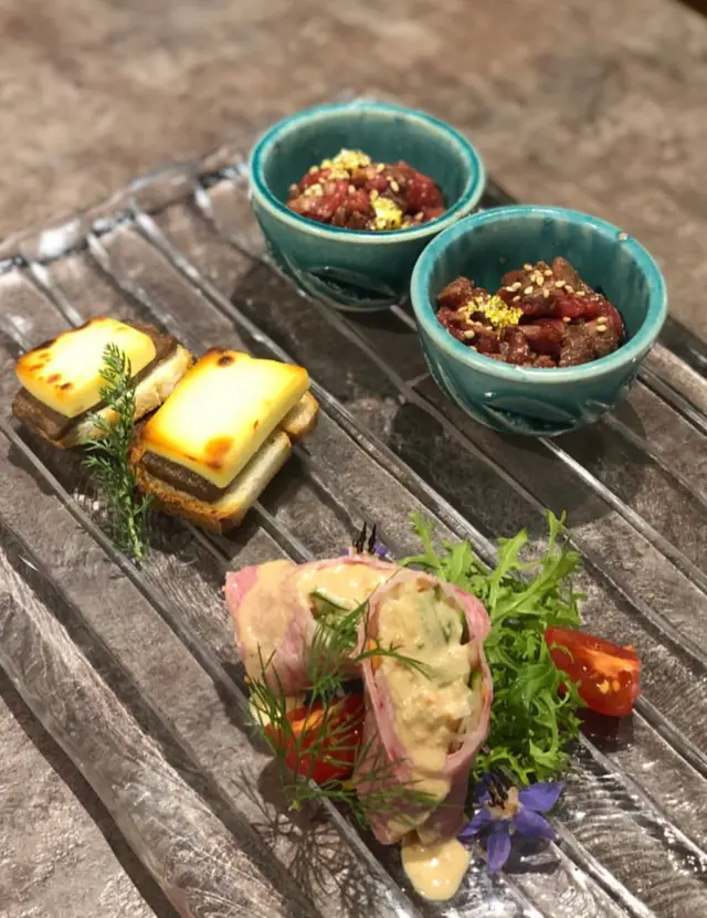 情人節當然去試新餐廳,聽說Marble主打的尾崎是百分百純種日本和牛,之所以叫Marble是因為和牛上細緻平均的大理石紋油花。先來刺身頭盤,賣相精緻再加上乾冰,整件事很配合情人節,味道都算不錯。再來尾崎牛刺身,上面加上海膽,口感幼嫩,一口過,油脂香在口腔內迸發。這餐廳亮點之一就是這件迷你牛三文治,日本面包帶很重的奶味,包著燒過的薄切尾崎牛加上帶點甜味的自製醬汁。這件三文治似曾相識,我大膽講句,如果和大熱的Wagyumafia吉列牛三文治比,個人覺得這件更加值得試,肉質細嫩,肉汁更多,面包厚度也剛好,令人回味。下一道是燒過的牛肉卷蘸點溫泉蛋漿,,加上面層的薯絲,哇,脆口之如整件牛好像在我口中慢慢溶化,覺得不夠飽的可以伴上白飯。另一亮點是牛肉shabushabu,意想不到的好,最讚的是湯底,肉質滑嫩牛味重。總括而言,這個價錢非常值得再來一次。…查看更多