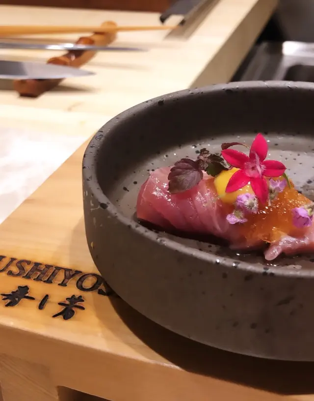 說真的,如果要選傳統的Omakase,Sushi Yoshi絕對不適合你,因為大多數人都會覺得Sushi Yoshi太花巧,無錯,因為他們擅長的是用不同的食材加上創意來表現破格壽司手藝。一坐下來,可見餐廳所有東西都是創意可嘉,務求達至盡善盡美。第一款刺身入口清甜,開胃。我最喜歡的白子也出現了,杯邊放上少許海鹽,一口倒入口,太好吃。用竹葉包裹鯛魚壽司真係第一次見,一放入口很強的櫻花味,酸酸甜甜很奇怪,但配搭完全沒有違和感。大拖羅也沒有失望,油脂豐富,肉質肥美,完全沒有'根'。北寄貝口感清爽,非常新鮮。個人最喜歡的是這兩款: (上)拖羅卷,魚肉香甜軟腍。(下)吞拿魚漬壽司,應該有用秘製醬油醃過也不失其鮮味。每一款菜式也有不同的調味,所選的食材、調味料都是最佳配搭。午餐來說,就能品嘗到質素不錯的料理,又做到這個水準,算是不錯的選擇。個喜歡於同一個套餐中,表現同一食材的不同處理手法,味道多變。…查看更多