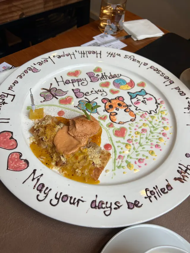 喺網上見到呢間餐廳嘅畫碟好靚,就揀咗呢間餐廳同朋友慶生。事前用whatsapp同餐廳講咗想畫咩公仔同埋係慶祝生日。Book咗weekend食lunch,本身見到呢間餐廳評價都唔錯,食物出乎意料比預期仲要好食😋Set lunch menu都有好多選擇,食之前冇諗住寫食評就冇影到。Set lunch有3個course。龍蝦湯好濃,老闆娘話冇加忌廉煮。豬手嚟到先知係拆晒骨嘅,好淋好入味。油封鴨脾畫碟嘅甜品就只可以揀banana roti/ brownie,揀咗banana roti。畫碟真係好靚呀。喺香港食嘢中伏太多,好多時又貴又唔好食。呢間餐廳係近年食過其中一間性價比好高嘅一間,好滿意,一定會再嚟👍😋…查看更多