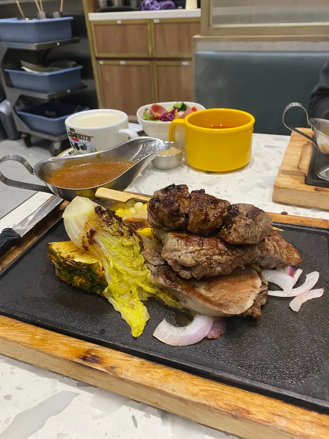 入到去店員話佢哋新出咗個簡約晚餐嘅餐牌😂睇落去又好豐富好多嘢食,又有得鋸扒😗於是今晚試試佢!牛魔王雜扒 $138分別有牛柳,安格斯牛串同牛舌😍鍾意食牛嘅人一定好鍾意,因為啖啖都係牛🤭有得揀熟度,我就揀咗5成熟,里個熟度最好食🤤我揀咗蒜蓉汁,味道合宜!!個底仲有啲配菜,好得,有菠蘿,娃娃菜,粟米,炸蕃薯粒!!👍🏻👍🏻美式雜扒 $98食肉獸留意🤭一次過滿足晒你四個願望,非常抵食!!有雞扒牛扒豬扒,仲有腸仔同火腿😳絕對對得住呢個價!上菜嘅時候,成座山咁,好誇張😂同樣地都有嗰啲配菜👍🏻呢個餐仲配有餐湯,餐包,沙律,飲品,小食!超多嘢食,我哋放到成枱都係😂😂特別要讚吓個沙律,好有誠意!!有蘆薈粒,比較少見,仲要有啲鴨胸😍好食!…查看更多