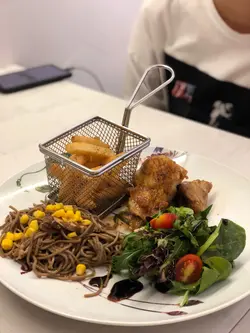 照燒雞扒配前菜日式蕎麥冷麵雞扒上菜既時候已經切好左一舊舊,好細心