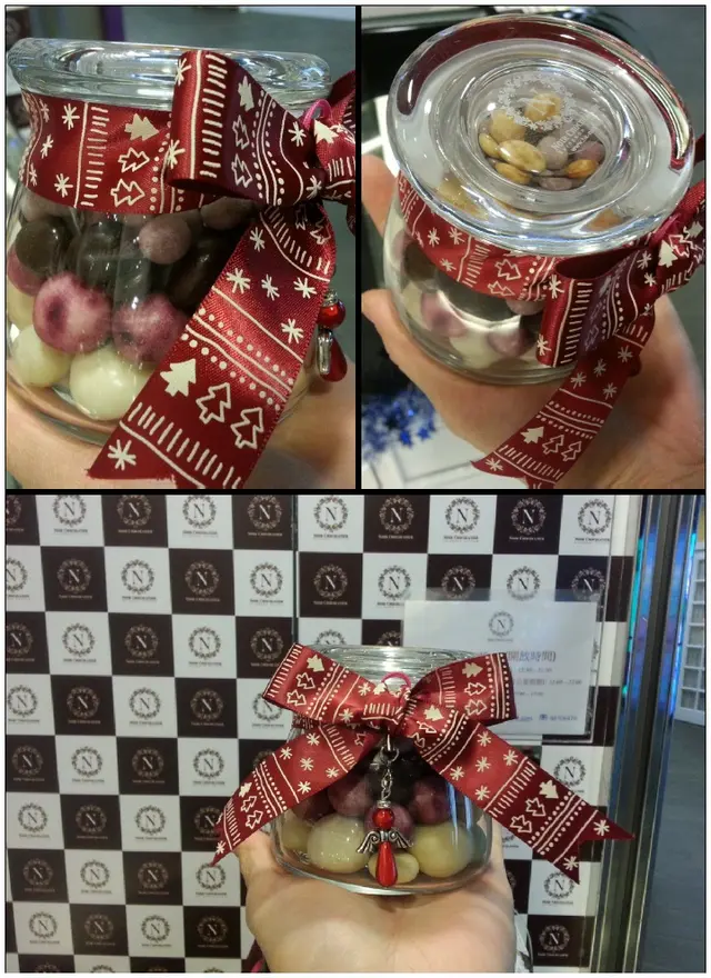其實我嚮九龍灣工作, 之前巳經發現呢間舖頭既朱古力好味, 只係朱古力有點小貴, 所以間中先黎入貨. 今日黎補買份聖誕禮物俾好朋友, 服務好到唔俾番個讚都唔得, 平日唔寫食評既我都上黎讚吓先.0個日我揀左個玻璃樽做禮物, 咁我唔想要入左既, 就問個姐姐可唔可以自己即時入, 佢就拎個吉樽俾我話 "緊係得啦".我其實都幾笨手笨腳, 搞左一輪, 又想砌一層士多啤梨一層黑加侖子一層紅莓, 終於問個姐姐幫我, 個姐姐話冇問題, 不過要等, 叫我行幾圈先返黎攞.其實我都冇乜野行, 行開一陣就嚮戲院0個邊望返去舖頭, 見到個姐姐好有心機咁幫我逐粒砌, 都好快就幫我搞掂, 咁我就立即飛撲返埋去, 佢話呢排送緊小天使, 問我要咩色, 個小天使好精緻, 我就叫姐姐幫我綁埋隻天使上絲帶度, 嘩, 我覺得真係好靚呀! 仲係我獨有既添~~