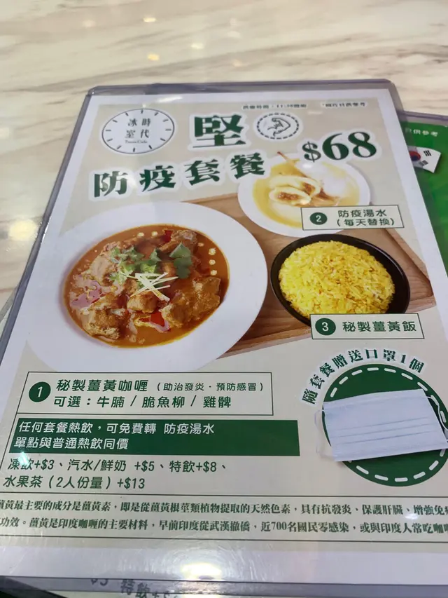 癲左啊!!!點解一間茶記可以有咁多選擇!!!日韓港式都有!!!睇完menu之後決定短期都食佢做lunch,返工唔帶飯⋯⋯本身打算同同事落去買外賣嘅,但點個姐姐見我地兩個人望望menu,望望條等外賣既長龍,同我講⋯⋯入邊有位,唔洗等喎⋯⋯well,我屈服,即刻入左去。因為第一次食時代。之前無做咩功課,睇睇menu第一樣野,就係防疫套餐,又岩時勢又岩feel,最緊要夠重口味。一於就試試佢!出餸好快,因為我有條80歲婆婆嘅脷,如果個咖喱可以熱到㷫口就更好了!咖喱唔太辣,岩晒想食咖喱又怕太辣嘅朋友,因為秘製嘅關係,仲隱約食到D蕃茄味。仲叻叻係佢用左superfood——薑黃入饌,真係有助增強免疫力,同時唔怕難入口。對營養有少少研究嘅我,見到呢個配搭,決定食左先講!叫左秘製咖喱牛腩,牛腩唔會過肥,有少許筋腱位特別好食,加試個汁無極重椰汁感覺,好似light啲可以食多兩啖肉。成個飯份量算大,大男人食的話都夠食,可能係香港人關係薑黃唔習慣,會食得慢少少。重點係,因為份量都唔少,D肉又好好食,得食剩左半碗飯,然後⋯⋯樓面姐姐好善良有心咁同我講,你下次食唔晒可以叫少飯,仲可以平一蚊添!正正子,又慳錢又環保同唔怕浪廢,有貼心嘅提醒,唔似得其他茶記怕煩寫咁多野,草草了事就關人。呢個貼心係茶記世界度加分!!!個防疫湯水似得出清甜味,有心認真。同事食左巨人漢堡扒奄列飯,個漢堡扒個樣唔夠靚仔,但個內心都認真有加洋蔥。個飯就你茄汁撈出黎嘅,比香飯好,但始果係炒底記perfect池喇!anyway,沙津菜量很好,唔係伴碟type咁少,中午飯黎講,PASS!…查看更多
