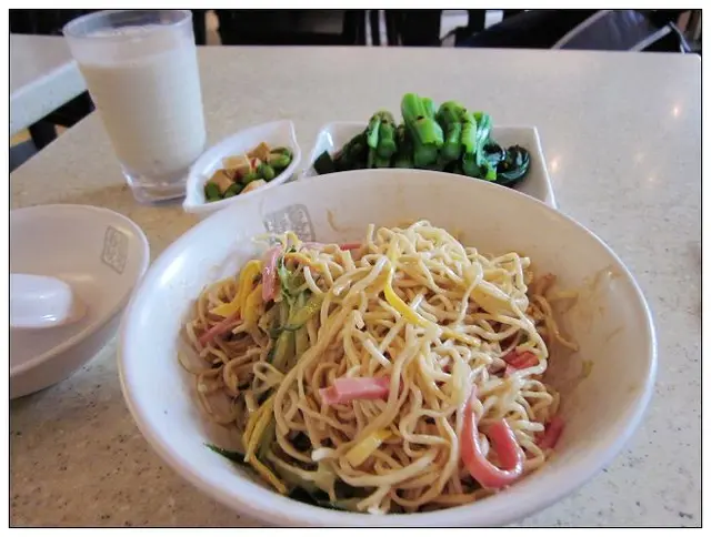 午餐和下午茶有好多口味可以選擇,主菜又可以配上菜飯、白飯或湯麵,選擇更多。今天好熱,看到MENU上有上海冷麵,沒吃過耶,點來嘗嘗看。冷麵有加上蛋絲、雞絲、青瓜絲、火腿絲,再佐上淡淡的麻醬,的確是蠻清爽的,但我個人覺得麵條太硬,還是鐘意湯麵的滋味。套餐有附一碟小菜和一杯豆漿,加十元就可再點一盤青菜,一個人吃真的很豐盛。之前有吃過東坡肉,嫩而不膩,蠻有水準的。…查看更多