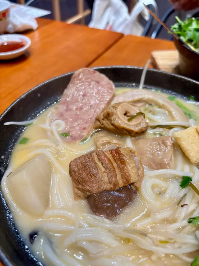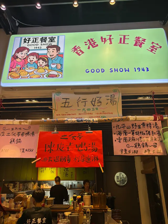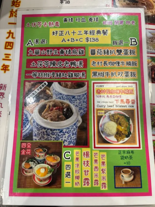 今日灣仔天陰陰,微微濕氣,最啱就係搵間餐廳坐低飲返碗熱騰騰嘅靚湯。路過好正餐室,原本以為係新開茶記,點知原來係有年資嘅老字號。餐牌厚厚一本,中西合璧,選擇多得嚇人。點咗個**經典套餐($138)**,入面有: 土茯苓陳皮老鴨湯** 老村長咖喱牛腩飯** 芒果紫米露** 奶茶**另外再追加兩款湯粉甜品組合: 海南一等胡椒豬肚雞腳湯米粉($78)** 川芎白芷魚頭湯(+$40)** 椰汁紅豆涼粉鴛鴦冰(+$19)**三款湯都係主角級表現—— 🏅**土茯苓陳皮老鴨湯夠火喉,湯底清潤帶微微陳皮香,飲完真係舒服到嘆一聲。🏅**海南一等胡椒豬肚雞腳湯就啱晒想驅寒嘅日子,胡椒味夠濃夠辣,豬肚和雞腳都煲得好腍,入口即化,飲完整個人暖晒。🏅**川芎白芷魚頭湯用上川芎白芷,帶少少藥膳香,但唔會苦,湯底濃郁又冇腥味,真材實料完全感受得到。配埋主食同甜品,飽足感十足,仲唔收服務費,員工又有禮,坐得舒服,真係好正。…查看更多