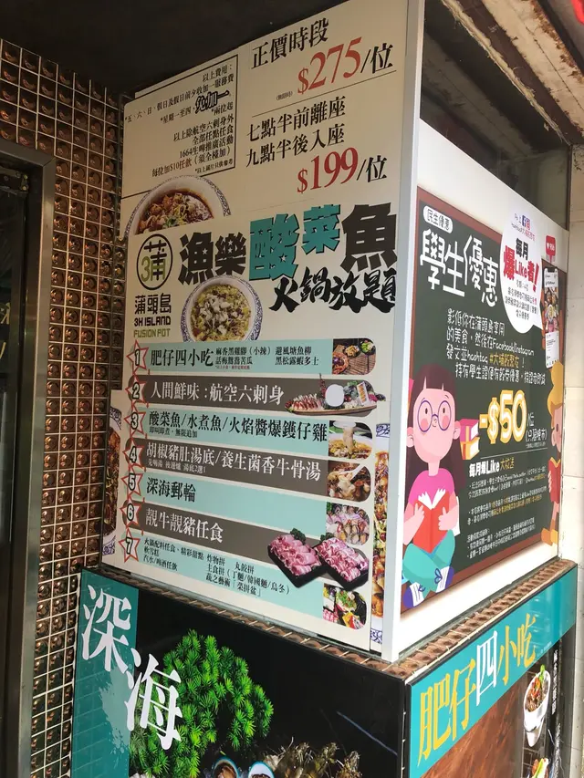 朋友推薦便過來一試,結果非常滿意;先來四款小食,蝦多士和話梅苦瓜最啱我口味,之後刺身拼盤,有牡丹蝦海膽帶子生蠔(問員工話他是日本蠔)仲有北寄貝油金魚,樣樣都好新鮮,跟住食酸菜魚,味道唔錯,啲魚都好滑,湯底我揀咗鹹菜胡椒豬肚湯,D湯真係幾好味,豬肚和粉腸部好好吃,跟住上咗海鮮拼盤,店員跟我說,海鮮和火鍋配料全部任點任吃(完原酸菜魚和小食都係),響鈴是他們自己炸的,口感及味道比起坊間啲現成響鈴,好吃好多,我兩個人飲咗1664生啤4杯,合共收費$20 ,勁抵,食埋軟雪糕,飽到不可以形容。下次約齊五個人,見隔離枱用條幾大條的木刺身船上枱,又發光又噴煙咁,好似幾過癮。後生仔揸學生證,仲有$50折扣優惠。