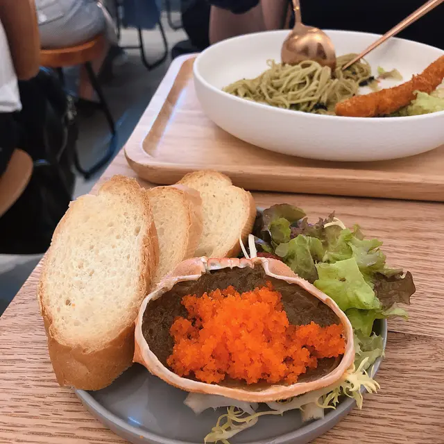 平日Lunch都好多人排隊呀嗰日好彩1230去到前面得一個人 等咗5分鐘就入得 但喺入面之後見到岀面好多人等喇✨甲羅燒小法包🦀hk$78蟹膏上面放咗好多蟹子 Baguette 烘脆咗 如果多2塊包就好 因為蟹膏有啲咸 另外係 依個小法包好耐先上到 等咗差唔多成40分鐘 所以趕時間真係唔好叫😂✨吉列蝦綠茶素麵 hk$88依個個樣好靚 吉列蝦係正常 但麵真心唔好食 啲麵煮太耐 一夾就斷 仲要冇綠茶味😫✨Latte✨chocolate飲品拉花都好靚 咖啡好香同朱古力好濃👍🏻…Read More