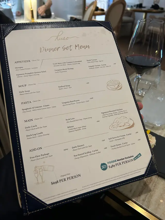 性價比首選 HUSO 2025-01-021. 性價比好高 抵食又好味2. 格調好 地理位置優越3. 三五聚會 首選!4. 用埋openrice訂非常抵75折叫左dinner set menu very nice and worth to order.…查看更多+ 4以上食評乃用戶個人意見 , 並不代表OpenRice之觀點。讚好分享性價比首選 HUSO https://s.openrice.com/QrbT0fK9P00檢舉 張貼 評分5味道5環境5服務5衛生5抵食用餐途徑堂食