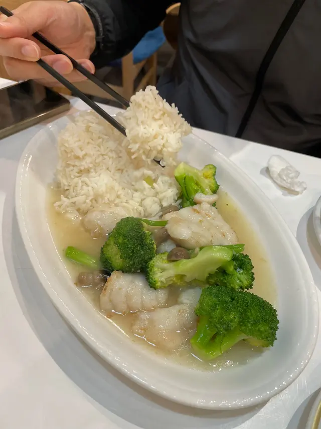 ,飲咗好多,暖晒!同伴叫左西蘭花魚飯,煎魚塊唔係炸,唔似出面咁多粉漿,啖啖肉,好似健康啲👍🏻伙記(又好似老闆)送我地飲燉蟲草花燉湯,味道清淡,普普通通,加$10飲都合理。可以安哥
