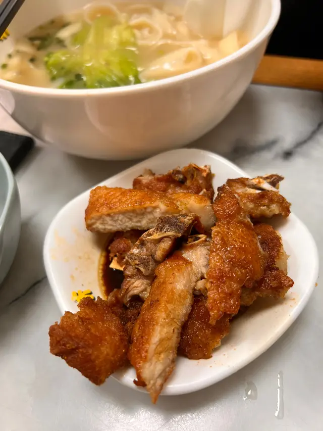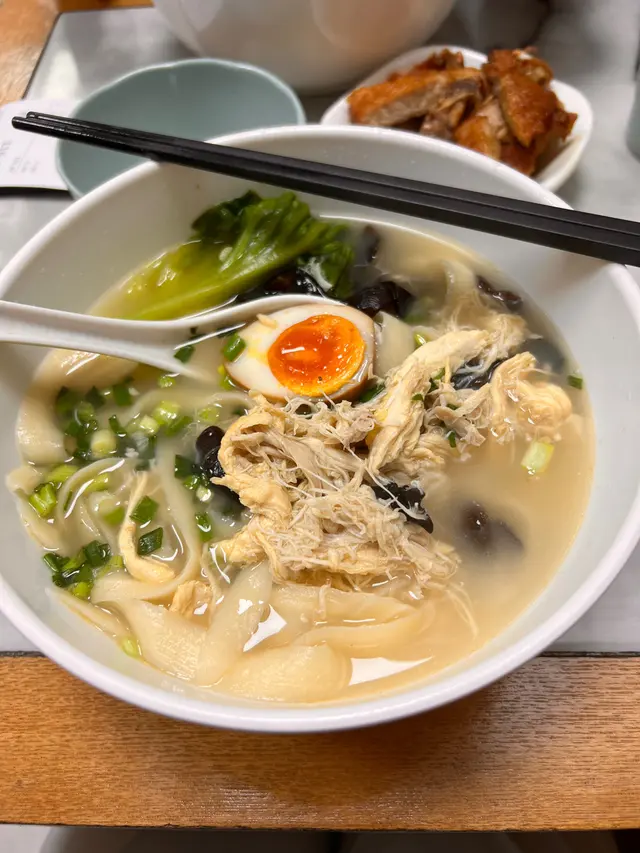 手撕雞溫泉蛋刀削麵:溫泉蛋入味,雞絲真的是手撕,麵質滑而有𡁻口,湯清甜,又好味又健康,食得好放心。
