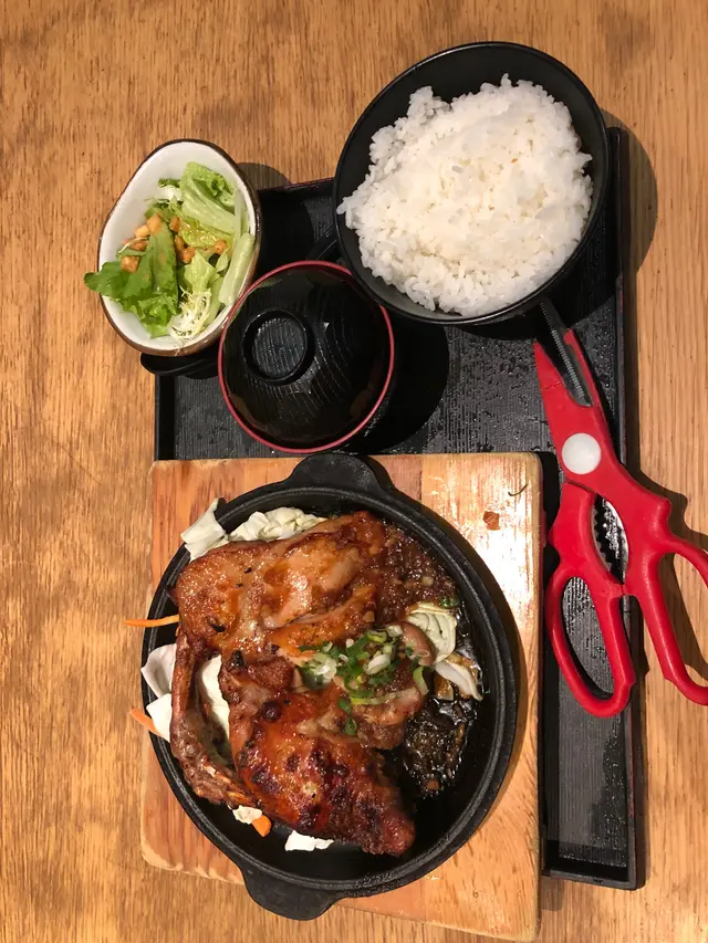 大型連鎖日本快餐。$88巨型雞腿午餐。前菜沙律:普通,記得要撈一撈底個汁先食雞腿:的確幾大塊,似豪大大雞腿貨源。個鐵板唔算太熱,仲配把剪刀比你剪肉食,幾好。味道蒜香味十足,肉質幾嫩口,唔錯。配飯同麵豉湯,湯冇過咸。送杯茉莉綠茶,冇茉莉味,垃圾。環境:幾靚有裝飾,座位舒服。總結:呢個價位性價比ok,會再黎。…查看更多